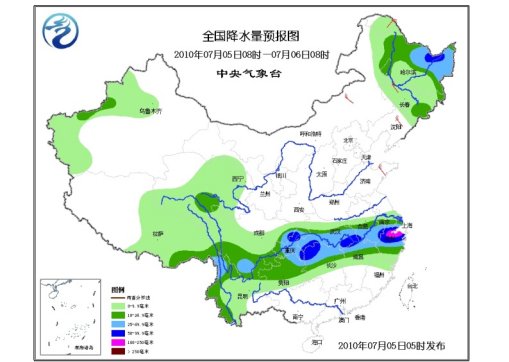 中新網7月5日電 中央氣象臺今晨6時發布短期天氣預報,未來三天,青藏高原中東部、西北地區中東部、西南地區、江漢、江淮、江南中北部等地有降水,其中,重慶大部、湖北南部、湖南北部、安徽南部、江西北部、浙江大部、福建北部等地有大到暴雨、局地大暴雨,西藏東南部、云南西北部等地有大雨;新疆北部、內蒙古東北部、東北大部多陣雨或雷雨,其中,黑龍江東部、吉林東部等地的部分地區有大雨、局地暴雨。上述部分地區并伴有短時雷雨大風或冰雹等強對流天氣。
