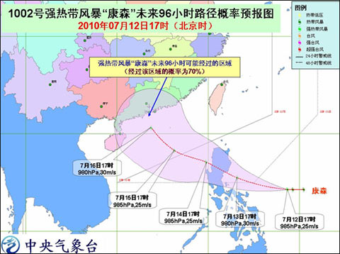 預計,“康森”將以每小時20-25公里的速度向西偏北方向移動,強度還將有所加強,并逐漸向菲律賓呂宋島東部一帶沿海靠近,將于14日傍晚前后進入南海東部海面。