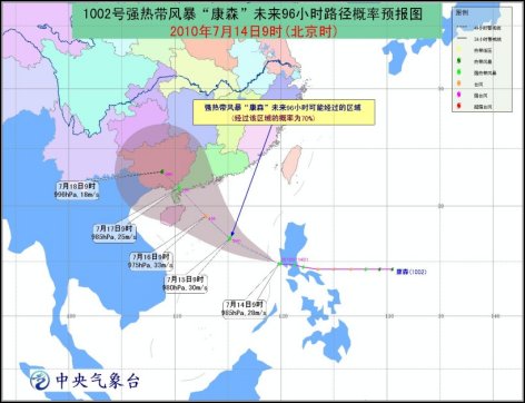 預計,“康森”將以每小時20公里左右的速度繼續(xù)向西偏北方向移動,未來有可能再次在南海海面加強為臺風,然后逐漸向廣東臺山到海南萬寧一帶沿海靠近,并有可能于16日夜間到17日下午在這一帶沿海登陸。
