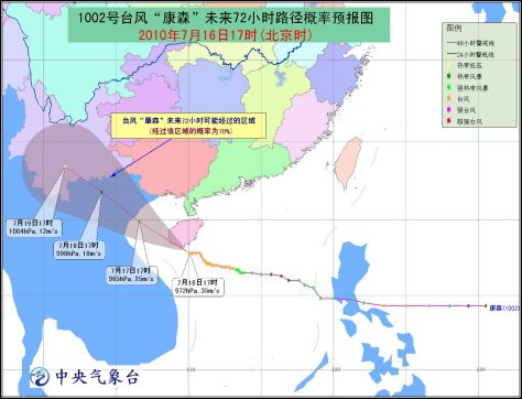 預計,“康森”將以每小時15-20公里的速度向西偏北方向移動,將于16日夜間在海南三亞到樂東一帶沿海登陸;也有可能從海南南部近海擦過。