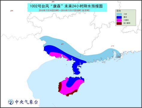 受其影響,16日晚上到17日白天,南海西北部、瓊州海峽、海南省及其沿海、廣東西部沿海、廣西沿海、北部灣將有7~10級大風,“康森”中心經過的附近海面或地區的風力可達11~12級,部分海域或地區陣風可達13~14級;廣東西南部、廣西南部、海南將有大到暴雨,其中海南、廣西南部的部分地區有大暴雨,海南南部和西部的局地有特大暴雨。
