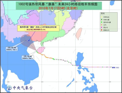 今年第2號臺風“康森”的中心已于16日19時50分在海南省三亞市沿海登陸,登陸時中心附近最大風力有12級(35米/秒),中心最低氣壓為968百帕。17日凌晨2時“康森”在海南樂東近海減弱為強熱帶風暴,4時前后進入北部灣海面,5時其中心位于北緯18.9度、東經108.5度的海面上,中心附近最大風力有11級(30米/秒),中心最低氣壓為980百帕。