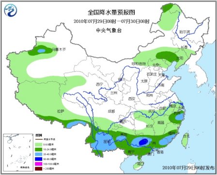 中新網7月29日電 據中央氣象臺預報,未來三天,新疆西部、青海西部、西藏大部、內蒙古中東部、東北、華北大部、黃淮西部、江淮大部、江漢、江南、華南、西南地區大部有小到中雨,其中,新疆天山南麓、黑龍江西北部、吉林東南部、遼寧中東部、河北北部、北京中北部、西藏東南部、云南大部、貴州南部、廣西中北部、廣東北部和珠江口地區、湖南北部和西南部、江西南部和西北部、福建南部和東部、浙江中部偏東地區等地有大雨,局地有暴雨;上述地區局地并伴有短時雷雨大風或冰雹等強對流天氣。