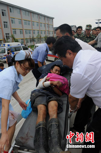 趕赴清平災區救援的第一架救援直升機降落在綿竹漢旺中學操場上,隨機救出的4名傷員被立即送往綿竹市人民醫院急救。中新網 王義超 攝