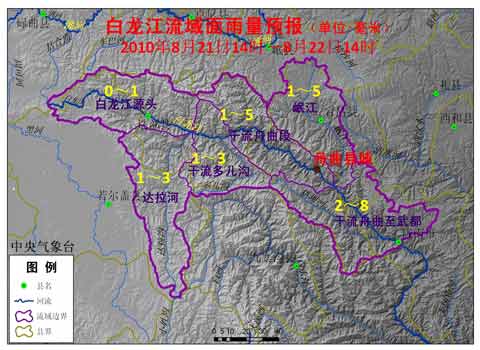 預(yù)計(jì),21日14時(shí)至22日14時(shí),白龍江流域面雨量有1~5毫米,其中干流舟曲至武都流域面雨量有2~8毫米,白龍江流域發(fā)生地質(zhì)災(zāi)害的可能性較大。