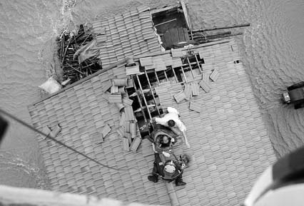 經過近兩個小時的飛行,B~7312救助直升機到達丹東機場中轉加油。此時傳來的消息是:洪水已經漲至齊腰深,4名群眾被困“孤島”。由于當地天氣突然變壞,潘偉隊長、副駕駛李春雨數次嘗試繞開雷雨區,均未成功。直升機隨即返航。