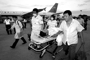 昨日下午5時許,北京急救中心安排了12輛車,到首都機場轉運傷員及隨行家屬。下午6時15分許,搭載有10名傷員的海航A320包機,降落在首都機場南停機坪。