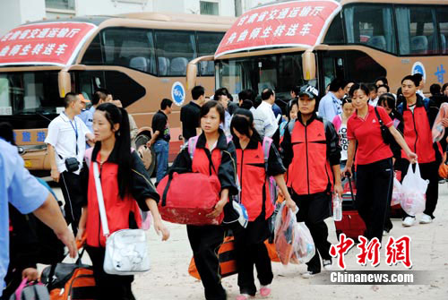 記者在現場看到,26輛豪華大巴分兩排停放在車場,1000多名學生身穿紅、藍兩種不同顏色校服,提著行李在老師和志愿者的幫助下排隊上車,從他們的表情中不難看出有幾分興奮與幾分憂傷,因為在他們當中,很多孩子還沒有離開過父母、離開過舟曲。一些家長淚流滿面依依不舍的送別孩子,并叮囑他們好好學習。