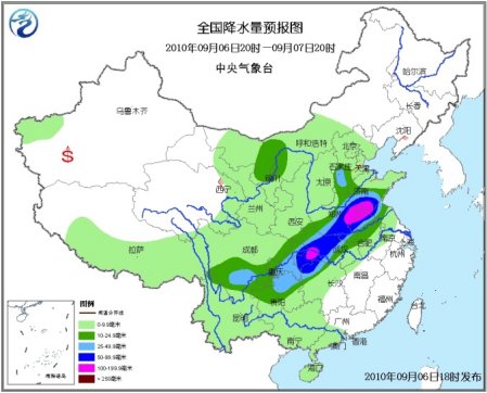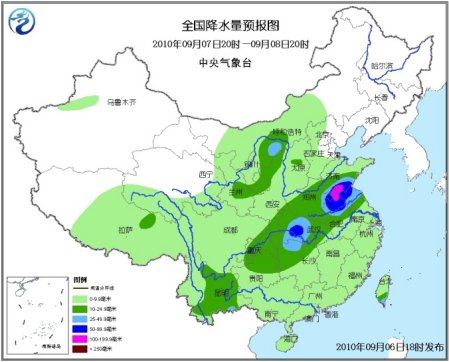 6日20時至7日20時,新疆南疆西北部、青海東部、西藏東部和南部、西北地區中東部、內蒙古中西部、華北、黃淮、江淮、江漢、江南西北部、西南地區及廣西、廣東西南部、海南等地有小到中雨或陣雨,其中,山東中南部、安徽北部、江蘇北部、河南東部和南部、湖北中西部、重慶中東部、貴州北部、湖南西北部以及川西高原東南部、河北西南部等地有大雨或暴雨,湖北西南部、河南中部偏東地區、山東西南部、安徽北部、江蘇西北部等地局部有大暴雨;上述部分地區并伴有短時雷雨大風等強對流天氣。新疆南部、內蒙古大部、東北大部、華北、黃淮東部等地有4級左右偏北或偏東風;南疆盆地的部分地區有揚沙或浮塵天氣。受“瑪瑙”、西南季風和冷空氣的共同影響,渤海、黃海北部的部分海域、黃海中部和南部偏東海域、東海東北部海域、臺灣以東洋面將有6~8級大風,“瑪瑙”中心經過的附近海域的風力將有9~10級,陣風可達11~12級。