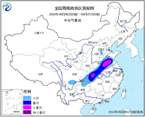 中新網9月7日電 據中國氣象局網站報道,6日,中國黃河流域到長江流域之間的大部分地區出現明顯降雨天氣。預計,6日夜間到7日白天,河南、安徽、江蘇及湖北局地將有大暴雨。