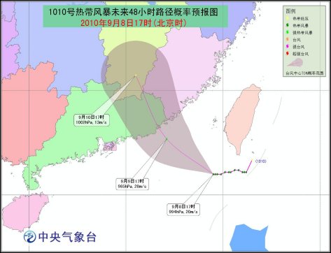 預(yù)計,風暴中心將以每小時10-15公里的速度向偏西方向移動,以后逐漸轉(zhuǎn)向西北方向移動,并向廣東東部到福建南部一帶沿海靠近,強度逐漸加強,將于9日夜間到10日上午在這一帶沿海登陸。