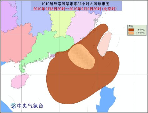 受熱帶風暴和西南季風共同影響,9月8日晚上到9日白天,巴士海峽、巴林塘海峽、臺灣海峽、南海北部和中部的偏東海面、臺灣東南部海面以及臺灣南部沿海、福建中南部沿海、廣東中東部沿海將有7-9級大風,風暴中心經(jīng)過的附近海面或地區(qū)的風力有9-10級,陣風可達11-12級;福建中南部沿海、廣東中東部沿海、臺灣中南部以及海南南部、廣西南部沿海將有大雨或暴雨。