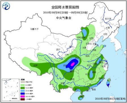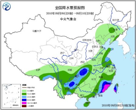 8日20時至9日20時,西藏中東部、青海南部、甘肅南部、寧夏南部、陜西、內蒙古中部、華北大部、黃淮、江淮、江漢、江南大部、華南以及西南地區等地有小到中雨或陣雨,其中,四川盆地、川西高原中部、甘肅東南部、陜西南部、重慶西部和北部、福建東南部沿海、廣東中東部沿海、臺灣中南部等地有大雨或暴雨,四川盆地東北部局地有大暴雨;內蒙古中部、山東半島東部、蘇皖中部、江西西部、廣西東南部、海南南部等地的部分地區有大雨;上述局部地區并伴有短時雷雨大風或冰雹等強對流天氣。新疆北部、甘肅西部、內蒙古中西部和東南部等地有4~6級風。受10號熱帶風暴影響,臺灣海峽、臺灣以東洋面和以南海域、南海東北部有7~9級大風,風暴中心經過的附近海域風力有10級,陣風11~12級;東海南部有5~7級東南風。黃海中北部有5~6級旋轉風;南海中部有5~6級西南風。