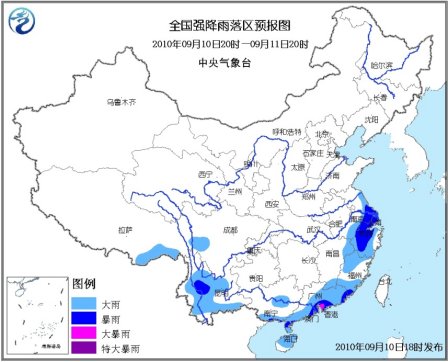 中新網9月10日電 據中央氣象臺網站消息,中央氣象臺9月10日18時發布暴雨藍色預警:9月10日20時到11日20時,江蘇東部和南部、上海、安徽東南部、浙江大部、江西東北部和東南部、福建西北部和南部、廣東大部、廣西南部、海南中北部、云南大部、川西高原南部、西藏東南部等地有大雨或暴雨,局地有大暴雨;上述地區局部并伴有短時雷雨大風等強對流天氣。