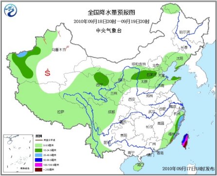 18日20時(shí)至19日20時(shí),新疆西部、青海大部、西藏大部、甘肅大部、寧夏、陜西北部、內(nèi)蒙古西部偏南和東北部、遼寧大部、華北大部、山東北部和東部、四川中西部、云南中西部、浙江東部、福建大部、臺灣、廣東東部、海南等地有小到中雨或陣雨,其中,浙江東南部沿海、福建東部沿海、臺灣、新疆南疆西部等地有大雨或暴雨;臺灣東部和南部的部分地區(qū)有大暴雨,局部特大暴雨;上述地區(qū)局部并伴有短時(shí)雷雨大風(fēng)或冰雹等強(qiáng)對流天氣。新疆大部、甘肅西部、內(nèi)蒙古西部等地有4~6級風(fēng);南疆盆地的部分地區(qū)有揚(yáng)沙或浮塵。臺灣海峽、臺灣以東洋面和以南海域?qū)⒂?~9級大風(fēng),部分海域的風(fēng)力將有10~12級,臺風(fēng)中心經(jīng)過的附近洋面將有13~16級大風(fēng);東海南部海域?qū)⒂?~8級大風(fēng)、陣風(fēng)可達(dá)9~10級;南海東北部海域?qū)⒂?~8級偏西或西北風(fēng)。