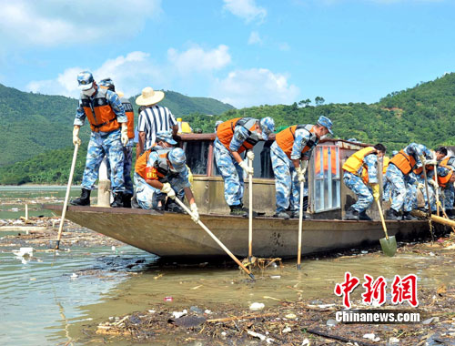 從昨夜開始,前期到達的部分官兵及工程車輛在高州重災區馬貴鎮,疏通道路、搜索失蹤人員、搶救物資;工兵分隊奔赴信宜市對危險山體進行爆破,部分陸戰隊員對廣東省第三大水庫高州水庫水面漂浮物進行清理。指揮員張文勝上校告訴筆者,目前工程機械分隊連夜打通長約1公里被泥石流堵塞的道路,清污的官兵已打撈起數十噸水面污染物,工兵分隊正在對爆破體進行前期論證。 完