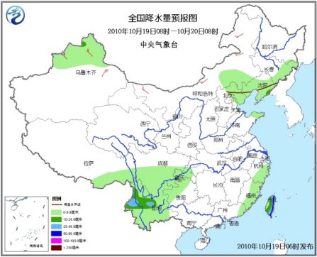 19日08時至20日08時,新疆北部、內蒙古東南部、吉林東部、遼寧等地有小雨(雪)或雨夾雪;河北東北部、山東半島、西藏東南部、四川中南部、重慶中南部、云南、貴州西部和北部、浙江東部、福建中東部、廣東東部、臺灣等地有小到中雨或陣雨,其中臺灣東部有大到暴雨,局部大暴雨;上述地區局部并伴有短時雷雨大風等強對流天氣。新疆北部、內蒙古中東部、遼寧南部、山東半島等地有4~5級風。臺灣海峽、巴士海峽、巴林塘海峽、南海大部、福建沿海、廣東東部沿海等海域有7~9級大風,陣風可達10~12級,其中南海東北部和中部偏東海域有10~12級大風,陣風可達13~14級,“鲇魚”中心經過的附近海面風力有13~16級,陣風可達17級以上;東海大部、北部灣有6~7級東北風;南海南部有5~7級偏西風。