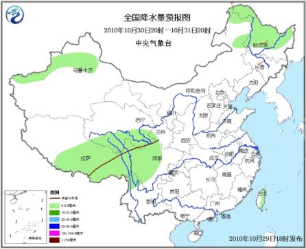 10月30日20時至31日20時,新疆沿天山地區、西藏東部、青海東南部、川西高原北部、內蒙古東北部、黑龍江中北部有小雨(雪)或雨夾雪;四川中西部、云南西北部、臺灣東部等地的部分地區有小雨或陣雨。內蒙古東部、東北中北部、華南沿海等地有4~6級風。臺灣海峽、臺灣以東洋面和以南海域、南海東北部海域、中部和西南部海域將有7~8級、陣風9級的東北風。另外,黃海南部海域、東海北部海域將有5~6級的偏北風;東海南部海域將有6~7級、陣風8級的東北風;南海西北部海域、北部灣將有5~7級的東北風。