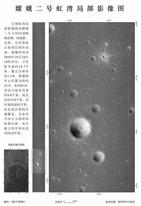 據(jù)中央電視臺報道,首次公布的月球虹灣地區(qū)局部影像圖是一張黑白照片。據(jù)國防科技工業(yè)局有關負責人介紹,該影像成像時間為10月28日18時,是衛(wèi)星距離月面大約18.7公里地方拍攝獲取。影像圖的傳回,標志著嫦娥二號任務所確定的六個工程目標已經全部實現(xiàn)。這意味著探月工程二期“嫦娥二號”工程任務取得圓滿成功。