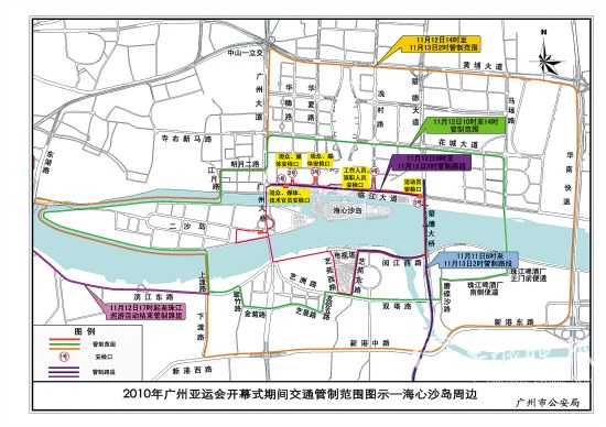 11月12日廣州亞運會開幕式將在天河區(qū)珠江新城南側的海心沙島舉行,廣州市政府、市公安局、市交警支隊9日晚召開了新聞通氣會,通告了當夜海心沙島周邊道路及珠江巡游兩岸道路分時分段交通管制的詳細措施。