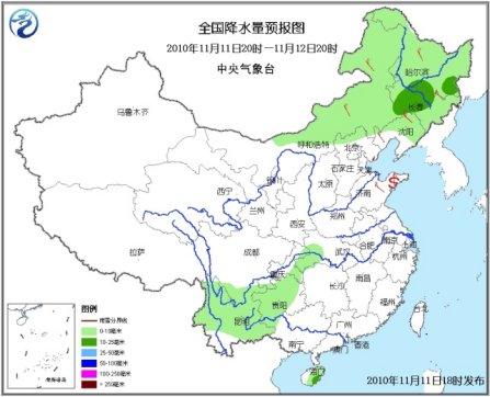 11日20時至12日20時,內蒙古中東部、東北大部、河北西北部等地有小到中(雨)雪或雨夾雪,其中,內蒙古東部偏南地區、遼寧北部、吉林大部、黑龍江東南部等地有大雪,內蒙古東部偏南地區、吉林中部、黑龍江東南部等地的部分地區有暴雪;川西高原南部、重慶東部、湖北西南部、云南大部、貴州大部、廣西西部、海南大部等地有小到中雨。內蒙古西部和東部、華北、東北地區、黃淮等地有4~6級風。山東半島附近有揚沙或浮塵天氣。渤海、黃海北部和中部將有7~8級、陣風9級的西北風;臺灣海峽、臺灣以東洋面和以南海域、南海東北部海域將有6~8級的東北風。