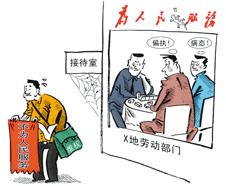 曾在無錫新區某公司工作的周力向當地勞動保障監察大隊實名舉報,要求公司補償加班費。但勞保監察隊負責人稱,從勞動的相關法律法規來看,想要從勞動部門解決此事,已經很難。為此,周力給勞動部門送上一幅“不為人民服務”的錦旗。(現關報道見今日本報8版)