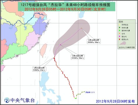 受“杰拉華”和南下冷空氣的共同影響,28日08時至29日08時,臺灣以東洋面、巴士海峽、南海東北部海面、臺灣海峽、東海大部海面將有7~10級大風,陣風可達11~12級,其中,巴士海峽、臺灣以東洋面、東海南部的部分海域的風力有11~13級,陣風可達13~15級,“杰拉華”中心經過附近海域的風力有14~16級,陣風可達16級以上;臺灣東部和北部將有大到暴雨,部分地區有大暴雨或特大暴雨。