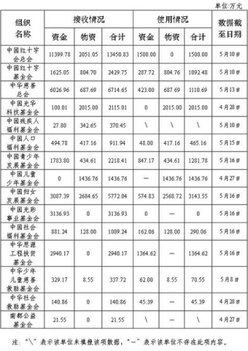 截至5月16日,中國紅十字會總會和14家在民政部登記的社會組織向民政部報送了救災捐贈統計數據。