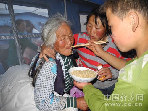在定西“7·22”地震中,岷縣梅川鎮永光村70多歲的李改花老婆婆一家5口有4人遇難,年僅10歲的外孫子后智斌一夜間變成了“小大人”。他說自己要好好孝敬外婆,讓外婆以后的日子過得幸?鞓贰D為小后智斌在抗震棚里給外婆喂飯。(記者 黃俊毅 攝)