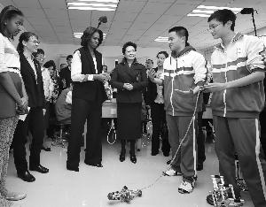 在學校的博學樓前握手并合影留念后,彭麗媛和米歇爾一行來到工程技術實驗室,參加幾何機器人課程。這是北師大二附中的特色課程之一,涉及數學、機械和控制三個學科。米歇爾對機器人頗感興趣,學生們向她介紹了一臺名為“BAD BOY”(壞男孩)的機器人,并邀請她親自用遙控器試一試。米歇爾按下遙控器,機器人卻沒動,學生們調侃說,“你看它就是很不聽話,需要好好溝通。”在學生們的指導下,機器人終于“聽話”了。