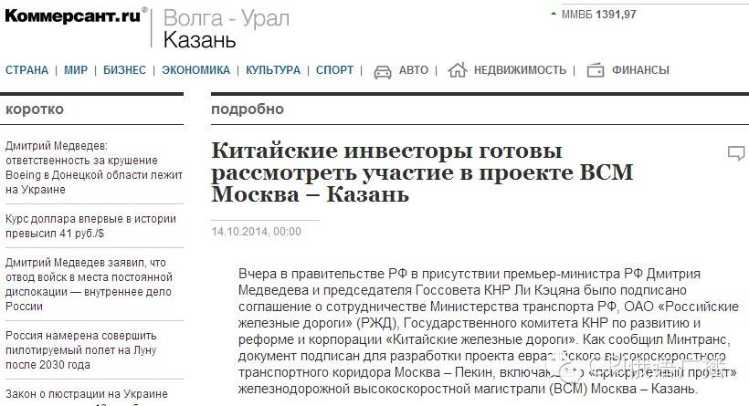 俄羅斯主要商業化報紙之一“生意人報”:中國參與俄羅斯的高鐵項目,這是李總理訪問期間最受關注的話題之一。如果連接中國、俄羅斯和哈薩克斯坦的高速鐵路網建設順利推進,將極大促進“絲綢之路經濟帶”戰略的實施。