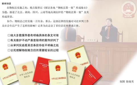 到今天為止,物權(quán)法已經(jīng)實(shí)施一月余。一個(gè)多月來(lái),物權(quán)法對(duì)司法審判及社會(huì)生活有哪些影響?記者對(duì)此進(jìn)行了深入采訪。