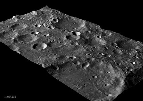 上圖顯示的是中國首張月球三維立體圖片,拍攝于距離月球200公里左右的飛行軌道上,成像區域和中國之前公布的第一張月球表面圖大致相當,位于月球正面的右下角,但是表面積略小。