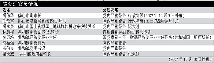 據監察部、國土資源部12月11日發布的通報,鶴山市通過偽造虛假材料和化整為零的辦法,擅自調整規劃、違法補辦手續,違規批準該市共和鎮3626.8畝土地用于工業開發,受到監察部、國土資源部專案調查組的嚴厲批評。記者采訪了解到,江門市紀委、監察局已經對鶴山市副市長馮偉華給予嚴重黨內警告、行政降級處分,給予國土局原局長任汝富黨內嚴重警告、行政降級處分。