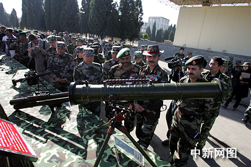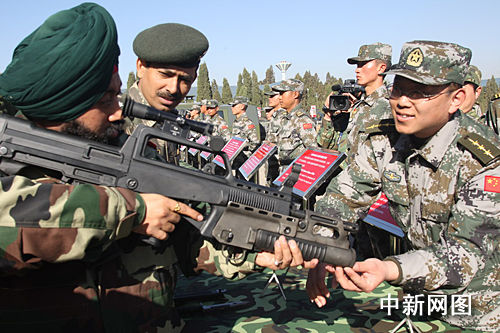 儀式結束后,中印兩軍參訓人員進行了技戰術基礎科目演示。雙方參訓人員還互相展示了各自的武器裝備,并互換武器進行了射擊。