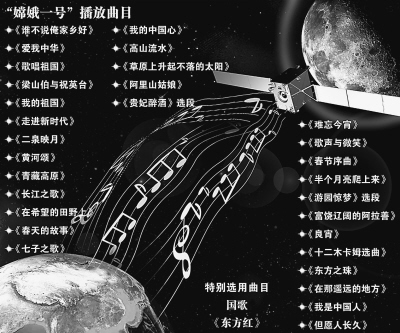 2006年7月7日,國防科工委宣布,要從數量龐大的中國樂曲中征集、遴選出30首優秀樂曲,隨嫦娥一號衛星搭載升空,在衛星距地球38萬公里的月球軌道上播放,并公布了150余首建議曲目。同年10月6日,國防科工委宣布,以公眾投票票數的多少決出了《誰不說俺家鄉好》、《愛我中華》、《歌唱祖國》等30首歌曲。而我國的國歌《義勇軍進行曲》和由我國第一顆人造地球衛星“東方紅一號”在太空奏響的樂曲《東方紅》因其特殊的地位,將另行安排在嫦娥一號衛星上搭載播放。