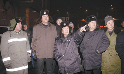 圖為新疆維吾爾自治區黨委副書記、自治區代主席努爾·白克力(左一),自治區黨委副書記、自治區常務副主席楊剛(右二),烏昌黨委書記、烏魯木齊市委書記栗智(右三),市委常委、市政協主席、市委秘書長黃公毅(右一)在火災現場指揮撲救工作。