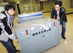 昨天下午1時許,在工作人員嚴密押送下,4個裝載著國禮珍品的密封箱運抵周鄧紀念館院內。還未見珍品,那些專門為展品“量身定做”的箱子就讓人很感興趣,每個箱子都有1米多高,由于展品極其珍貴且是易碎品,在包裝時里面不僅加了防震的材料,箱子外面也特別注明易碎標志,每一件珍品都被固定在專門的錦盒中,且是根據它們的大小和形狀量身定做的。