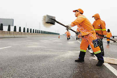 “我們主要是依靠人工鏟雪破冰。”長潭高速公路工程科科長龔嘯說,他們的45名養(yǎng)護工人,每天分兩個班次,在長達(dá)50公里的高速公路上進行鏟冰、撒鹽。