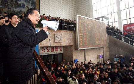 溫家寶還來到長沙火車站看望滯留車站的乘客。他動情地說:“對大家滯留在這里,我向大家表示歉意,我們正在抓緊搶修,首先是搶修電網,電網通了以后,火車就會通了,不需要很多的時間,大家就可以回家過年。春節快到了,我給大家拜個早年,謝謝大家!”