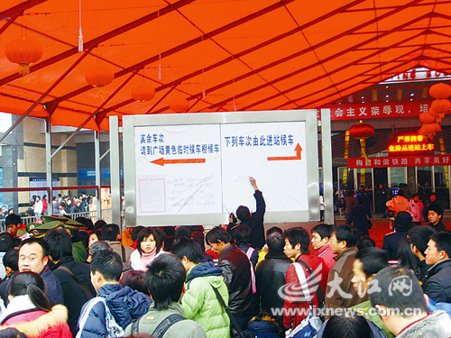 “下列車次在此進站候車,其余車次請到廣場黃色臨時候車棚候車。”在站前廣場,記者看到原先旅客等候進站的區域已搭起多個不同顏色風雨棚,在候車大廳門口的紅色風雨棚前,立著一塊提示牌,牌子上分左右列出了各趟列車的候車要求,因此旅客們可以及時得知自己所乘列車的運行情況,憑票提前2小時由此進站候車,而在一邊的黃色風雨棚內,則是等候稍晚到達列車的旅客。由于分類清晰,整個火車站的候車秩序良好。