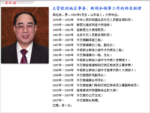 中國外交部資料顯示,吳紅波從二00五年起至二00七年擔(dān)任外交部辦公廳主任一職,二00七年至今擔(dān)任外交部部長助理。劉結(jié)一在二00六年至二00七年一年時間里,擔(dān)任了外交部美大司司長,二00七年至今一直為外交部部長助理。