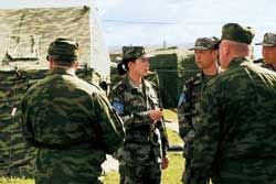 在“和平使命——2007”聯(lián)合軍演六國參演部隊演習場上,一位扎著馬尾辮的中國女少校引起俄軍官兵注目,大家都喜歡送花給她,稱她卡林娜,意思是來自中國的紅莓花。她叫董英華,新疆軍區(qū)某部副團職俄語翻譯。