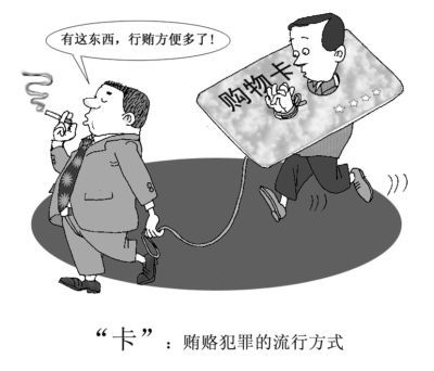 “卡”即代幣卡、購物卡等消費卡的代名詞。調查表明,在賄賂犯罪中,以卡代錢容易掩蓋赤裸裸的金錢交易。一張卡少則數百元,多則上萬元,因為它不像現金那樣扎眼,所以行賄者容易出手,受賄者容易接受。送卡已成為賄賂犯罪的一種流行方式。