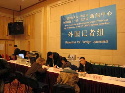 在記者的接待和安排方面,今年全國兩會在借鑒以前中共十七大期間一些好的做法的基礎上,還為中外記者推出了免費上網,免費提供有關中國的圖書資料以及咖啡和餐點等一系列的貼心“服務”。祝壽臣介紹說:“這屆的兩會新聞中心借鑒了十七大一些好的做法,當然同時也繼承了過去兩會新聞中心的一些好做法,增加了很多新的服務項目。比如第一次免費提供中央人民廣播電臺,中央電視臺的信號,第一次免費向記者提供新華社的適時新聞圖片,第一次免費向記者提供寬帶上網服務,同時我們還免費向記者提供咖啡和茶點服務。此外,這次兩會還提供了很多圖書資料,有中國政治經濟各方面的情況介紹,還有一些專題資料,資料種類大概有100多種,資料擺上來以后很快就被中外記者搶空了。”