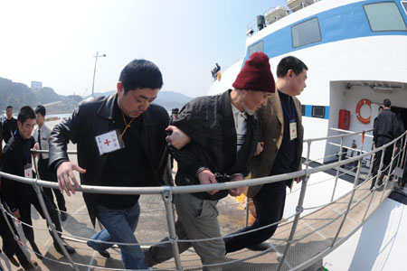 接下來的一切,是雙向遣返任務(wù)中的“常規(guī)動作”:確認(rèn)王志華身份無誤后,臺灣執(zhí)法人員把他移交給大陸有關(guān)人員。頭戴帽子、胡子花白的王志華卸下了臺灣的手銬腳鐐,換上了大陸的手銬,在一前一后兩個(gè)佩戴紅十字會證件的工作人員押帶下登上扶梯進(jìn)入“海峽”號。