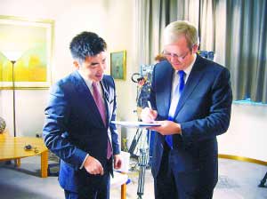 在陸克文的辦公室里中國文化元素隨處可見,陸克文特別喜歡一幅“旗開得勝”畫卷。日前,央視經(jīng)濟頻道主持人芮成鋼前往陸克文辦公室對這位“中國通”進(jìn)行了專訪。問答摘編如下。