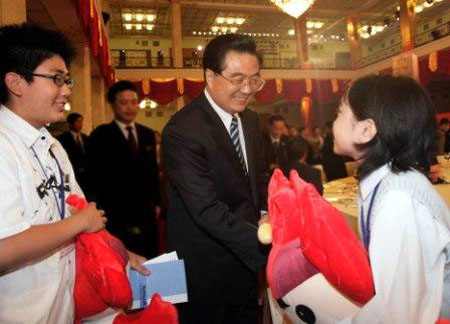 2007年6月19日,胡錦濤主席在北京人民大會堂出席“中日青年世代友好聯(lián)誼晚會”時,日本訪問團(tuán)中年齡最小的成員橫堀由、大木博來到胡錦濤面前,請胡主席為他們簽名。胡錦濤高興地對他們說,從你們身上,我看到了中日友好事業(yè)的希望。他將兩個北京奧運(yùn)會的吉祥物“福娃”贈送給他們。兩位日本少年臉上露出喜悅的笑容。