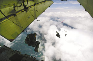 飛機(jī)再次進(jìn)入著陸場(chǎng)上空,第二批8名隊(duì)員緊接著跳下。