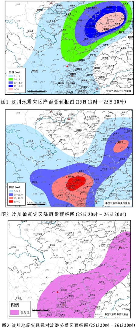 25日夜間至26日白天,四川、甘肅南部、陜西南部等地震災區將出現一次中到大雨、局地暴雨天氣,并伴有短時雷雨大風等強對流天氣。四川北川(包括堰塞湖地區)、理縣、汶川、都江堰、茂縣、綿竹的降雨量為20-60毫米,青川、廣元的降雨量為8-20毫米,甘肅文縣、陜西寧強和略陽的降雨量為3-10毫米,上述地區伴有短時雷雨大風天氣,請注意采取帳篷的防風防雷措施。